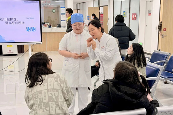 主院区门诊大厅内,工作人员为不同年龄层的患者讲解口腔护理知识,演示正确刷牙技巧,耐心解答市民关于口腔疾病预防、日常护理及就诊相关问题,引导群众重视口腔健康。