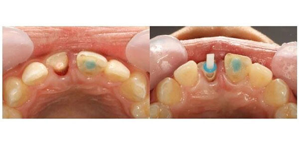 经过口腔检查,周伟伟看到,两颗门牙中那颗受伤更重的,确实是复杂冠根折:就是从牙冠到牙根都裂开了,牙神经也暴露了;而且折断的地方很深,一直延伸到牙龈下面。